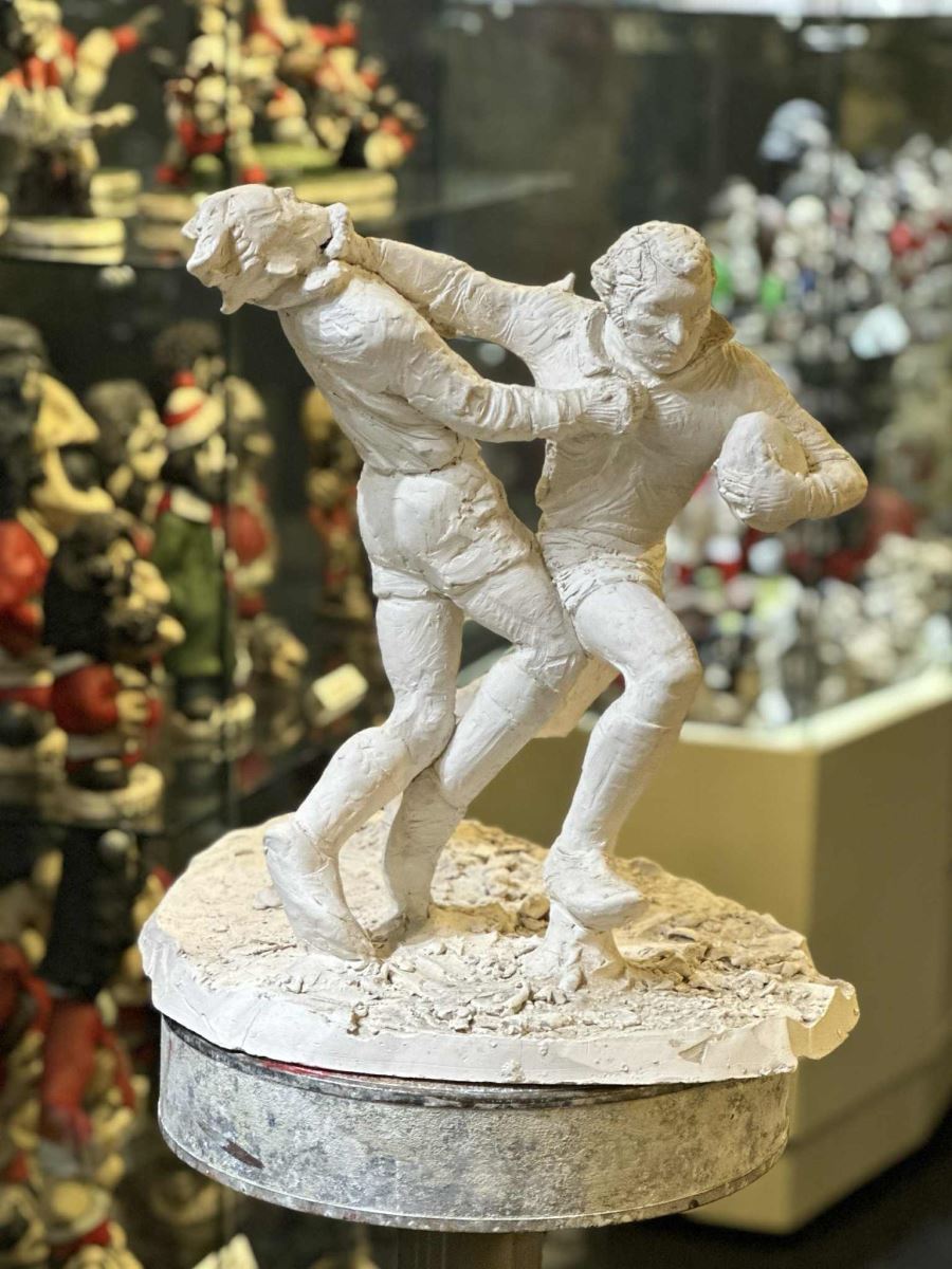 As a young Grogg maker it was an enthralling time to be involved in Welsh rugby. In 1976 the decision was made for me to leave school and join my father in his studio on the Broadway. Dad had been making rugby figures since the early 1970’s but I was hot on his heels, as I loved capturing the features of my heroes in clay. I was soon handed that role on a permanent basis and with it came the unique task of sculpting three faces in one piece - the Pontypool Front Row posed a new and exciting technical challenge for me.