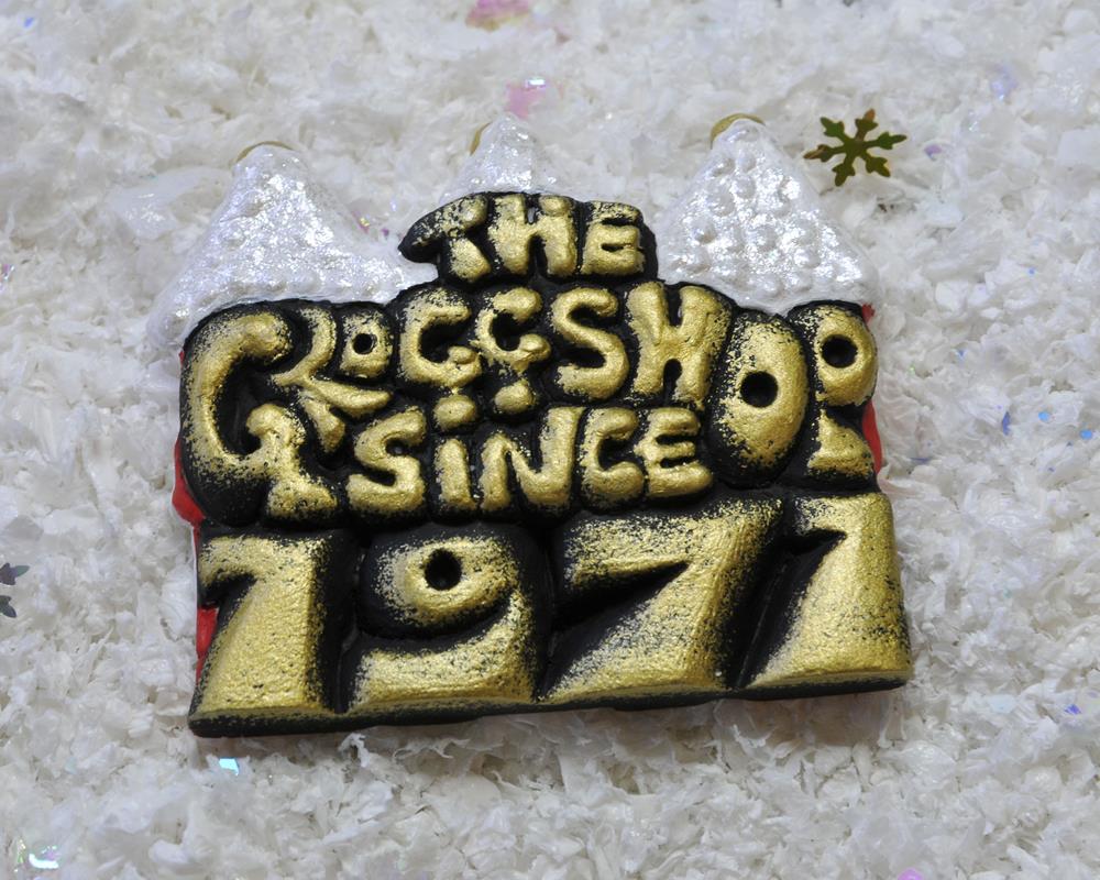Our 2022 Groggy Christmas Tree Decoration. Based on a gingerbread design of our very own Groggshop, complete with 'iced' windows and roof. The back of the piece commemorates our 50 years (2021) in the building.