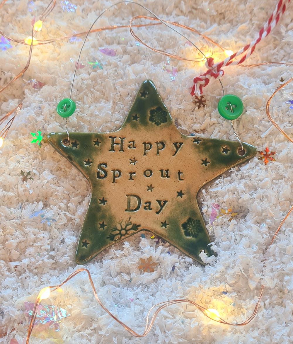 Handmade in Wales by Love & Lovelier ~ Ceramic Star Christmas Tree Decoration with Happy Sprout Day ~ Approx size 9cm x 9cm.