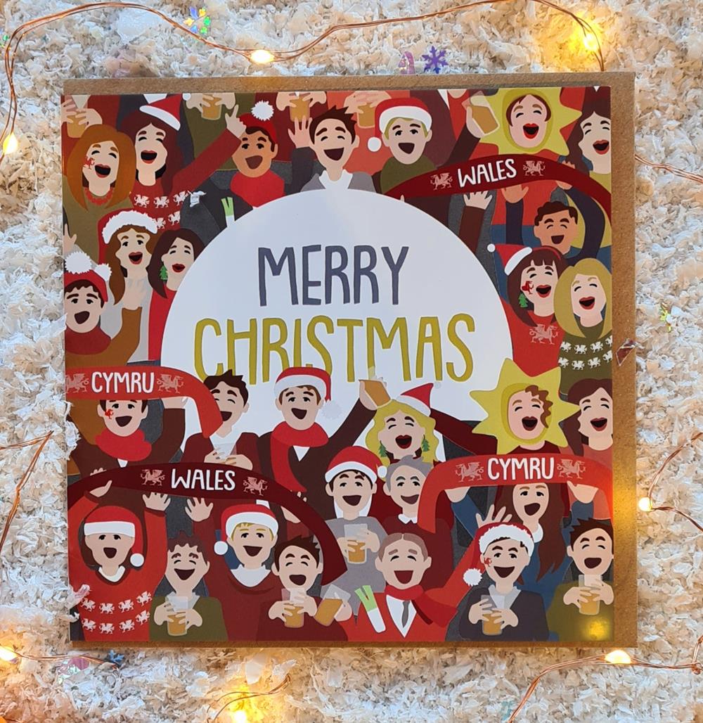 A gorgeous 148 x 148mm card Christmas card with the illustration of a crowd celebrating. The perfect card to send to wish a Very Welsh Christmas.