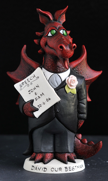 Our Bestman Dragon is a solution to your Wedding present for your Welsh Bestman! Personalise him with your names and date of the wedding and his name on the base, please use the photo as a template for your inscription. Can also be used for Father of the Bride/Groomsmen/Ushers, if no ‘Speech’ title is needed on the scroll please let us know in the notes section of the checkout.