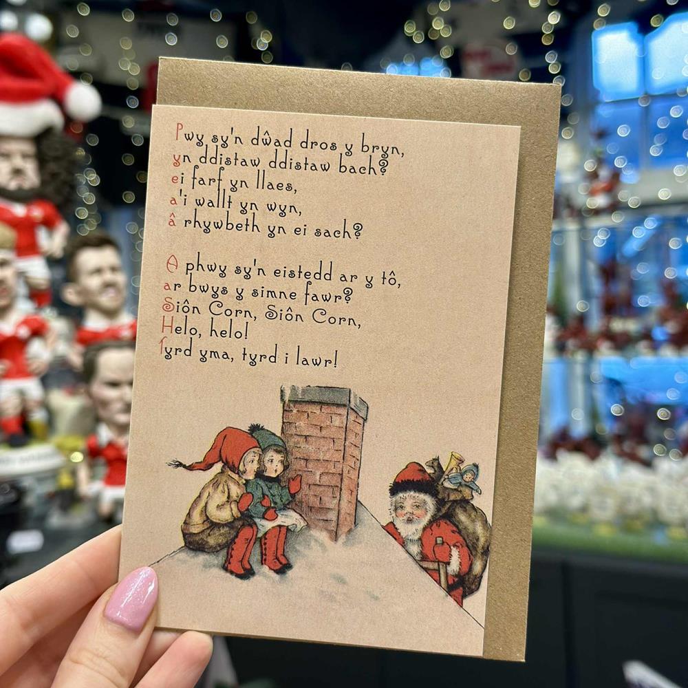 A lovely vintage design Christmas card featuring Sion Corn (Santa) atop a roof on Christmas morning.