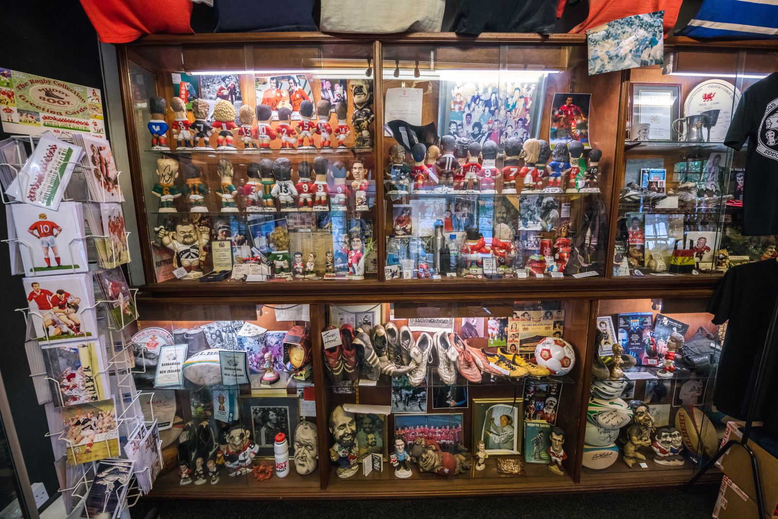 Inside, the rooms have changed use many times – some of the walls have come and gone and then come back again. The former garage is now the Groggshop museum, but for most of its life was our moulding room, with shelves full of moulds bearing the names of the world’s greatest rugby stars. The famous ‘Wall of Fame’ signature wall – now in my studio – was once in the firing room, which for many years housed two giant kilns. Simon’s packing room, in a former life, was the ladies powder room. The original main bar was Dad’s first studio, but over the years the shop space has grown to encompass the whole of the front of the building, its ceilings entirely covered with shirts (and shorts and socks) generously donated to us by international players from the past 50 years.